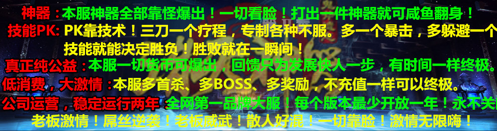 本服所有装备全部靠打,所有BOSS均有终极爆率,散人真实逆袭,长久稳定不忽悠!
